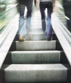 ausgiebig benutzt. Für mich sind Rolltreppen zwiespältige Fortbewegungsmittel. Zum einen erlebe ich sie als bequem, angenehm, andererseits behalte ich mir noch ein schmales Segment von Misstrauen und Respekt vor. Ich traue Rolltreppen nicht ganz. Ich gehe lieber zu Fuß. Ich gehe lieber selbst.